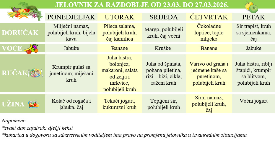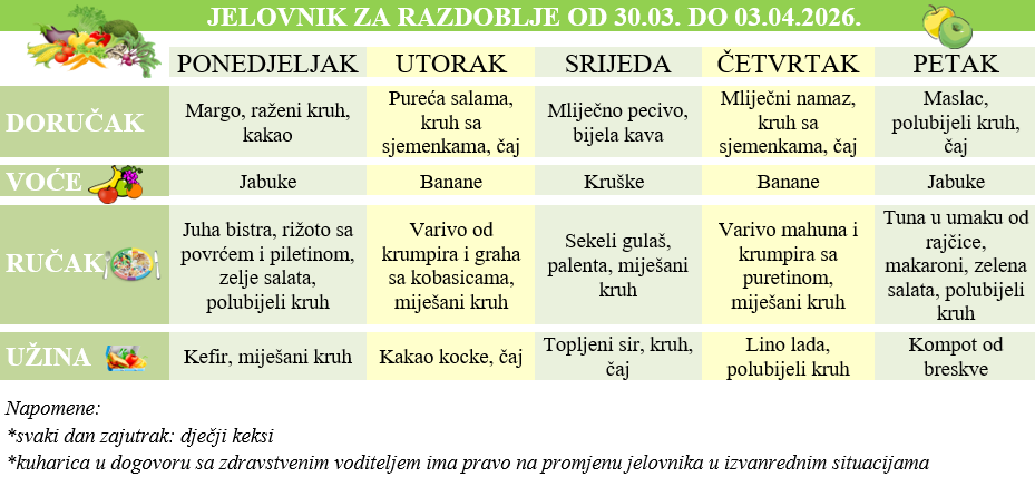 Jelovnik za period 30. Ožujak - 03. Travanj