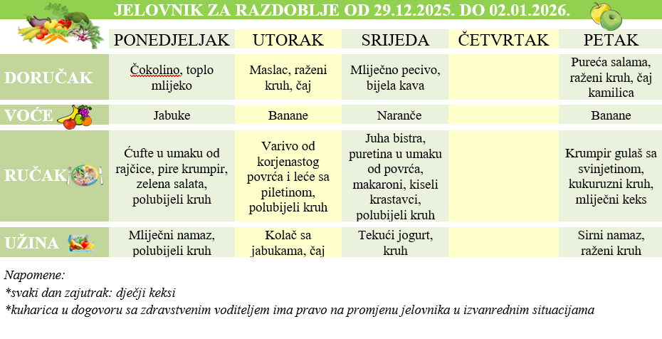 Jelovnik za period 29. Prosinac - 02. Siječanj