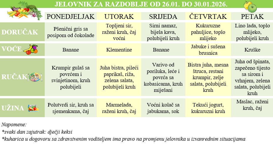 Jelovnik za period 26. - 30. Siječanj